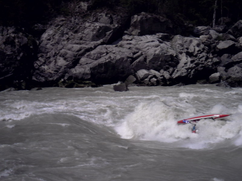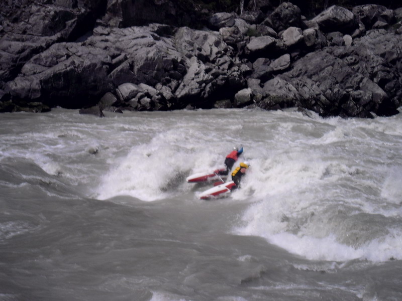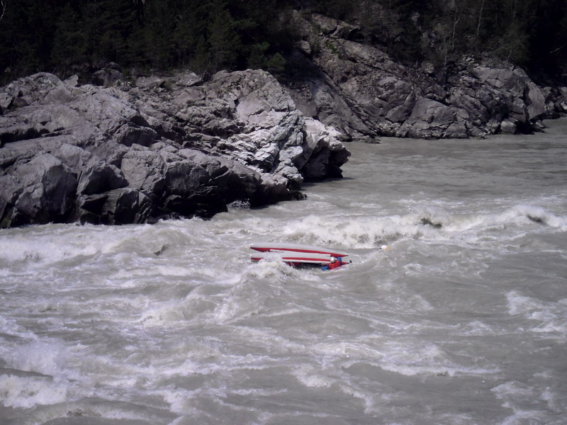 Женю с Сашей положило в первой ступени шабаша, по диагонали. Далее начались спас работы, Сашу выловили, а Женя с катамараном прошла вторую ступень, все обошлось парочкой синяков. Нас с Линой кувыркнуло во второй ступени, ее мы не просматривали, пошли сходу. Перед нами прошли Рома с Машей, они нас подстраховали. Мы слились по центру, как выяснилось в последствии туда, куда вообще не следовало идти. Видео и фото нет. С меня смыло очки и монтажную каску (мантажная каска не катит вообще для таких походов), выбило весло, Лина молодец, удержала свое весло и выловила мое. Катамаран зачалили наши спасатели, Рома с Машей, нас благополучно протащило по валам и выкинуло на берег. Лина проплывала мимо спас-ката, ей кричали чтоб хваталась, но она не смогла сориентироватся.