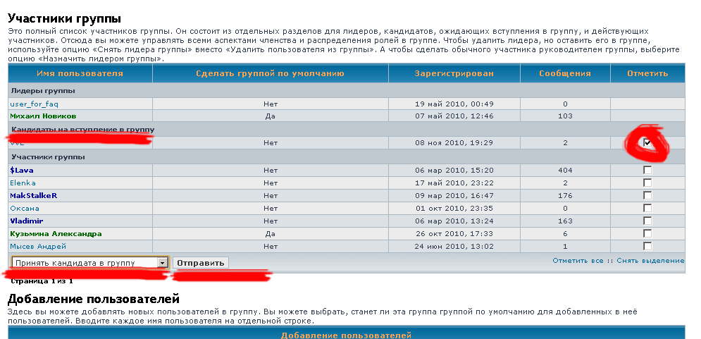 Заходим в личный раздел Далее заходим в группы Выбираем Управление группами Там - управление пользователями нужной группы В таблице смотрим на графу - "Кандидаты...". Отмечаем кандидатов, которых хотите принять, и выбираете "Принять кандидата в группу". Жмем Отправить. После этого лучше сделать для этого пользователя группу по умолчанию (если это его основная группа) Подтверждаем свой выбор - вот и всё!