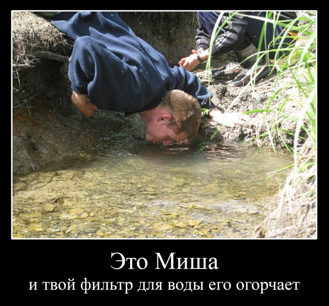 Поселок небольшой, всего две улицы. Более известный как «Куета». По словам Миши, здешние жители занимаются лесозаготовкой или просто приезжают на дачу По пути решили зайти в сие место за водичкой. Как оказалось, среди местных есть один авторитет, который хорошо знаком с командиром, и мы двинулись к нему на дачу.. все называют его «Шеф», и по слухам, это весьма легендарная личность среди туристов. О как… Его правда на месте не оказалось, и отряд расположился прямо во дворе … Но вскоре хозяин нарисовался, и мы с ним весело поболтали, рассказывая все нюансы проделанной работы. В процессе Стас достал таки из пакета со своим фильтром такую полезную вещь как инструкция по эксплуатации и с удивлением обнаружил, что из предложенных деталей он собрал действительно какой-то бульбулятор! Немного изучив схему сборки, он что-то там поколдовал, покрутил и в конце концов этот его чудо-юдо-аппарат заработал.. радости не было предела. Но время не ждет. Попив чайку и набрав воды идем дальше.. впереди последний пункт!