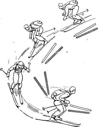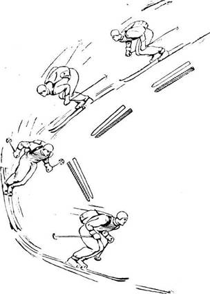 "Xристиания" на параллельных лыжах (рис. 26). Большая скорость и ровный снег допускают применение этого энергичного, точного поворота; сначала плечи слегка развертываются в сторону, противоположную направлению поворота. Одновременно лыжник слегка приседает. В последующий момент мягкое вращение плеч в сторону поворота, с одновременной подачей корпуса вперед и его распрямлением, а колен внутрь дуги поворота, перемещают тяжесть тела на внешнюю к повороту лыжу, воспринимающую нагрузку на свое внутреннее ребро. Вторая лыжа выходит несколько вперед, как бы "выруливая" поворот. Поворот заканчивается, когда лыжи подтягиваются одна к другой, приняв новое направление.