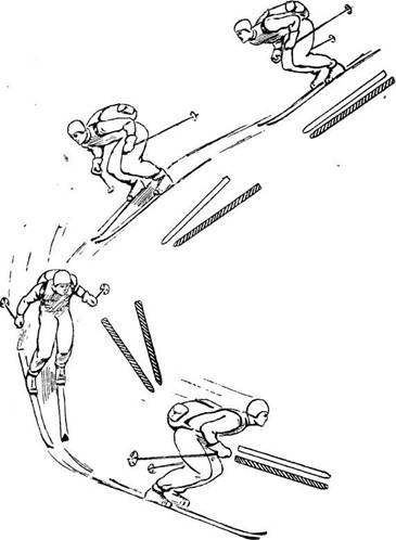 Торможение поворотами. Чтобы не развивать большой скорости на крутых неизвестных склонах и неровном снегу, особенно с проваливающимся настом, лыжник спускается зигзагами. Повороты при этом можно делать либо непрерывной змейкой (поворот из упора, поворот "христиания"), либо с разворотом - через ногу. Этот способ следует особенно рекомендовать в условиях проламывающегося наста; при этом лыжник де лает нормальный косой спуск, направляя лыжи так, чтобы в конце зигзага они слегка въезжали вверх. Когда лыжи начнут останавливаться, наружная лыжа разгружается, и нога махом переставляется на 150 - 180° в противоположную сторону вниз по склону; за тем к ней подставляется вторая нога, которая почти тотчас же воспринимает нагрузку. Поворот следует производить ритмично, как бы мягко перешагивая, почти без перерыва в скольжении. Втыкая палку, соответствующую стороне поворота, поддерживают равновесие.